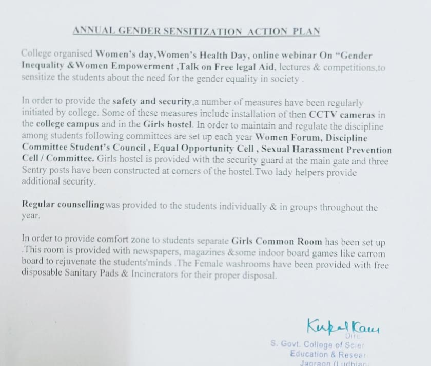 In order to provide safety and security a number of measures have been regularly initiated by the college. Some of these measures include installation of CCTV cameras in the college campus and in the Girls hostel. In order to maintain and regulate the discipline among the students the following committees are set up each year Women Forum, Discipline Committee Student’s Council ,Equal Opportunity Cell ,Sexual Harassment Cell /Committee. The girls hostel is provided with the security guard at the main gate and four Sentry posts have been constructed at the four corners of the hostel to provide additional security.